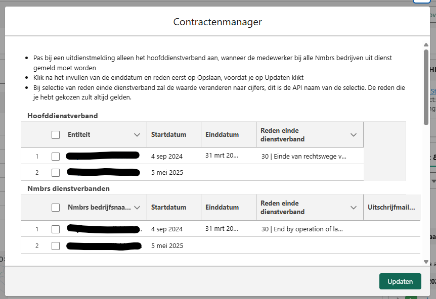 De werking van deze flow sluit zoveel mogelijk aan bij wat gebruikers al gewend zijn. Op het scherm verschijnt een tabel waarin de dienstverbanden van de medewerker overzichtelijk worden getoond. Belangrijke velden zoals einddatum en reden einde dienstverband kunnen hier direct worden aangepast. Zodra je op ‘Updaten’ klikt, worden de wijzigingen opgeslagen. Ook gekoppelde Nmbrs-dienstverbanden worden netjes meegenomen, zodat er geen dubbel werk ontstaat.