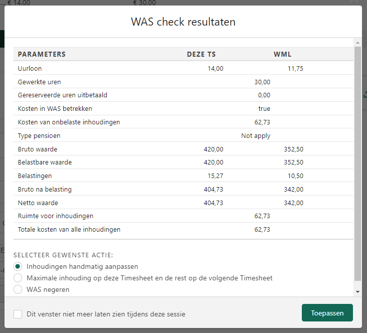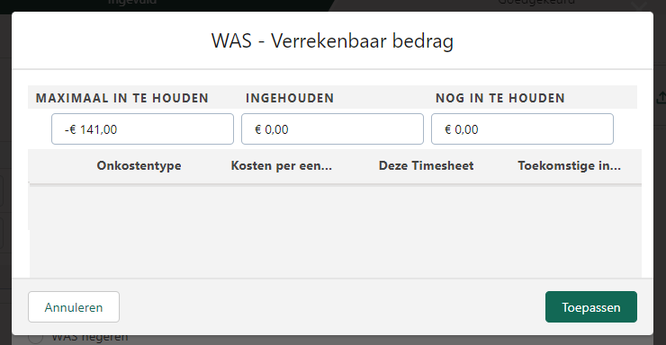Een eenmalige onkostensoort moet altijd volledig worden verwerkt. Als het bedrag méér is dan de WAS-controle toelaat, krijg je de WAS-controle pop-up na het opslaan van de timesheet.