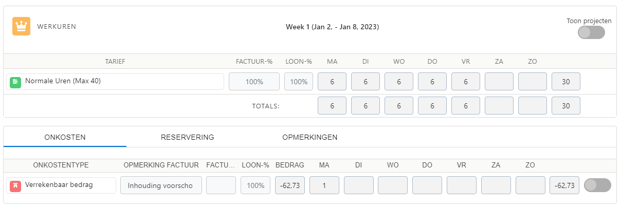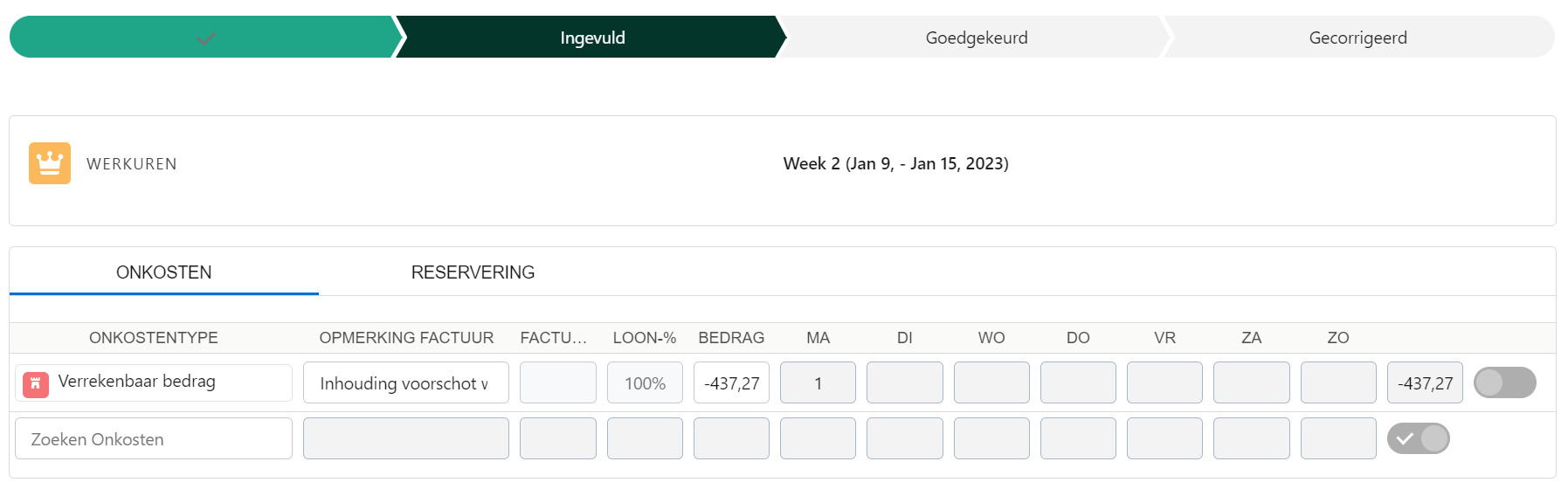 In elke stap van het opslaan en goedkeuringsproces wordt dit bedrag opnieuw gecontroleerd. Nadat de timesheet is goedgekeurd, zal dit bedrag ook van het verrekenbare bedrag worden afgehaald.