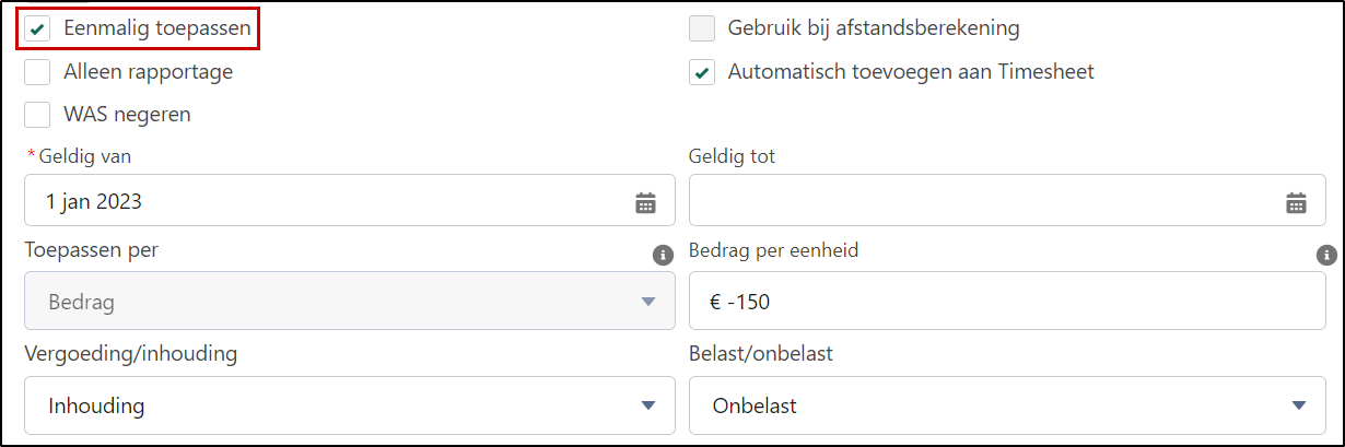 In dit geval maak je op dezelfde manier onkosten aan zoals benoemd in Onkostensoorten: Vergoedingen & inhoudingen. Hierbij zet je als optie het vinkje Eenmalig toepassen aan. Het bedrag zal dan op de eerstvolgende timesheet worden ingehouden.