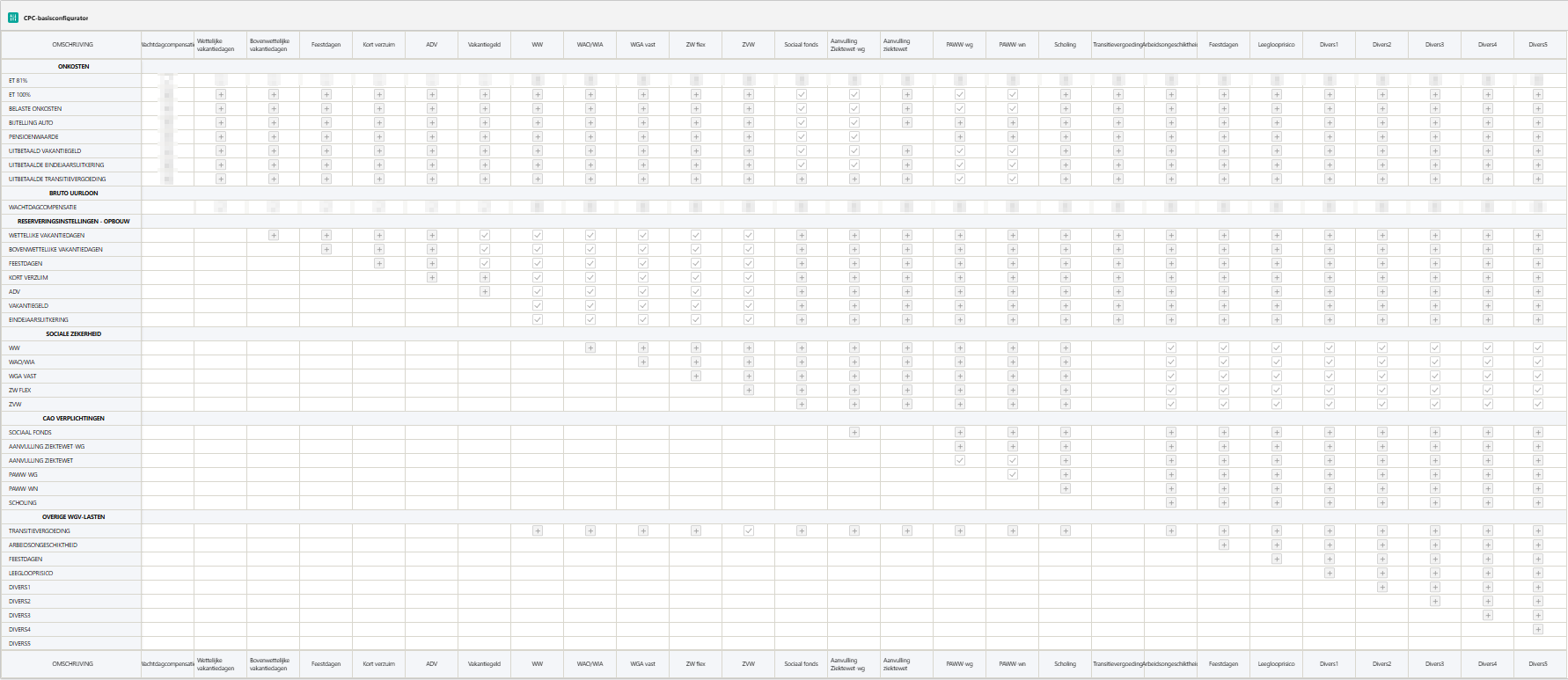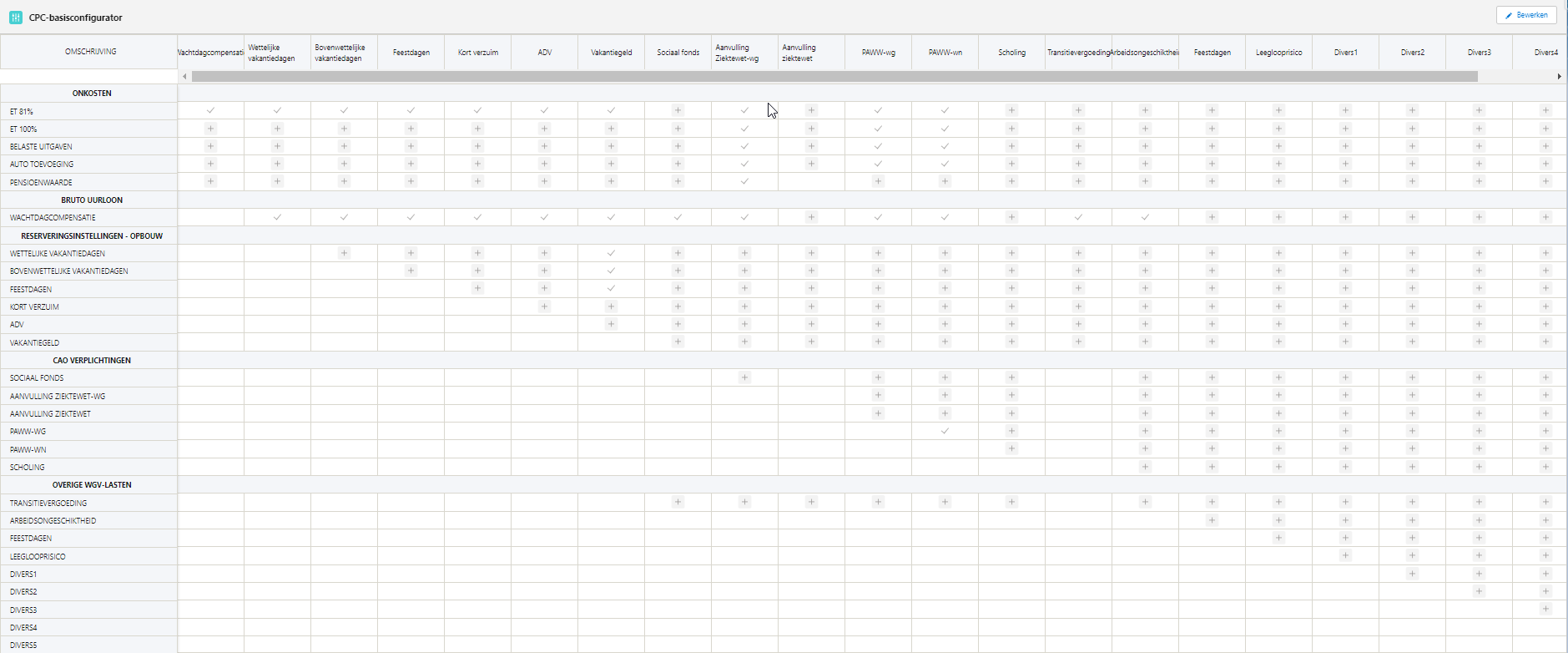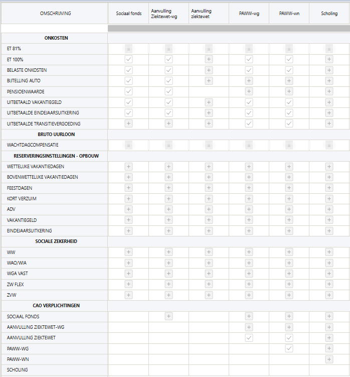 De kostprijs Basis dient verticaal gelezen te worden. De vinkjes geven aan of de gegevens (uit de kolom omschrijving) in de grondslag zitten. In de kolom van Vakantiegeld zie je bijvoorbeeld dat de grondslag ook de Wettelijke vakantiedagen, Bovenwettelijke vakantiedagen en Feestdagen meeneemt.