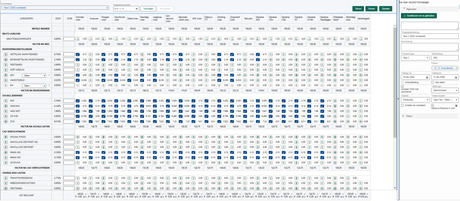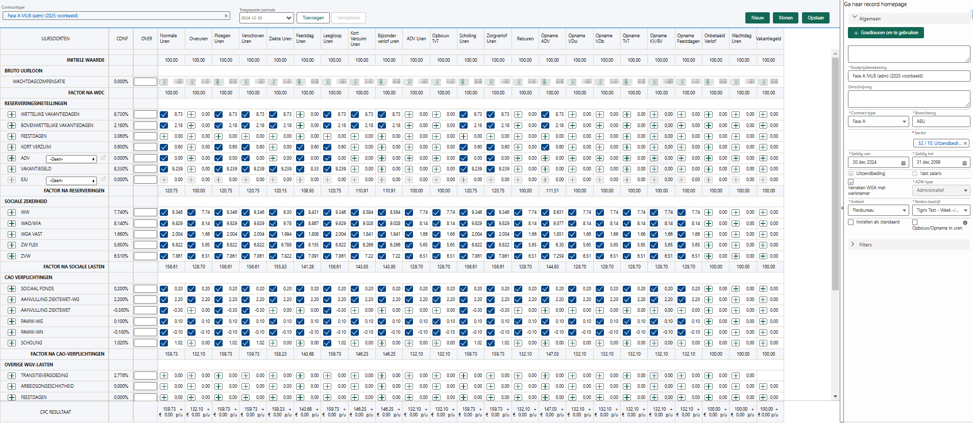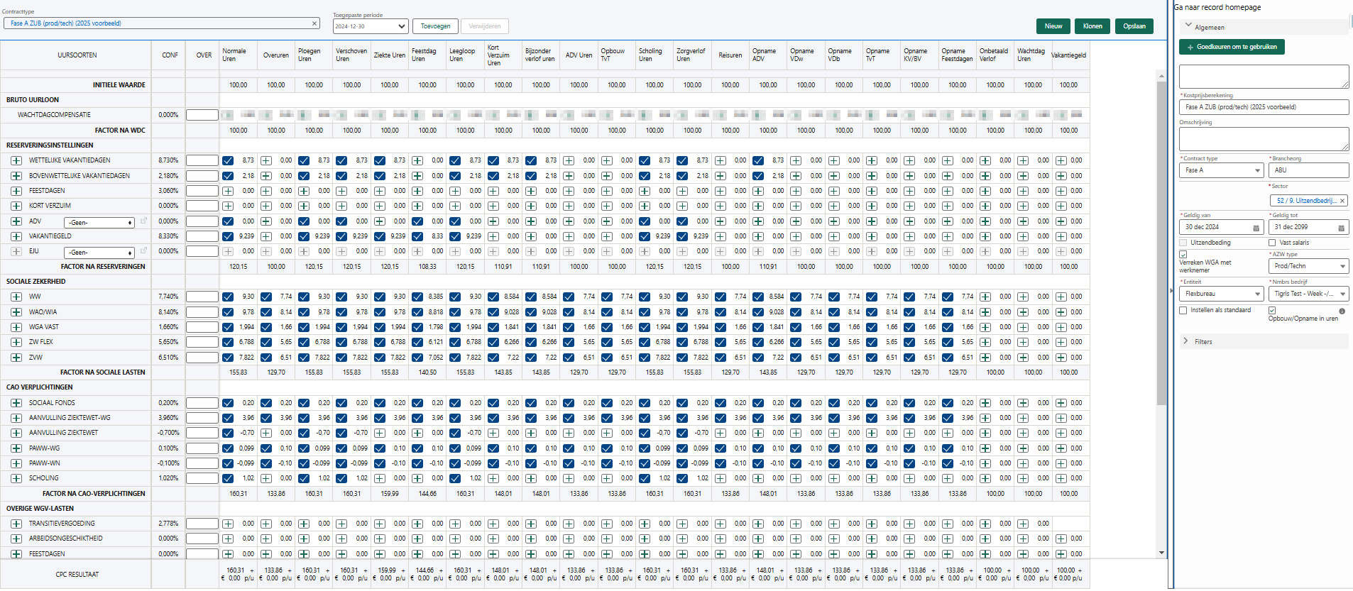 Nb: De rijen ET81% en Wachtdagcompensatie zijn nog zichtbaar in de Kostprijs Basis omdat dit componenten zijn die in het verleden actief waren. Deze componenten zijn nog wel zichtbaar maar niet meer actief, de vinkjes die hier aanstaan kunnen genegeerd worden. ET81% heeft geen invloed meer op loonberekeningen vanaf w1-2025.
