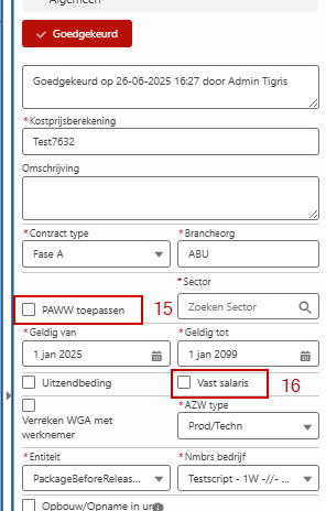 De checkbox inzake het toepassen van het uitzendbeding wordt automatisch aangezet als er gekozen wordt voor sector 52 / 10 of 52 / 11.