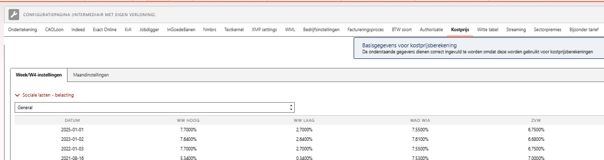 LET OP: Een override percentage in de kostprijs, wordt toegepast boven individuele regelingen. Gebruik in 2026 dus alleen een override-percentage in de kostprijs, als dit percentage ook echt moet worden toegepast in alle gevallen, voor alle gerelateerde plaatsingen. Regelingen voor CAO's of arbeidsvoorwaardenpakketten worden dan genegeerd.