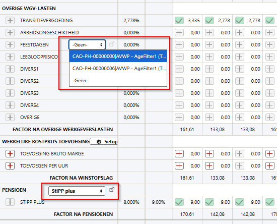 Ook kunnen hier percentages ingevuld worden voor Arbeidsongeschiktheid, feestdagen (als er collectief gereserveerd wordt), en leeglooprisico. De hoogte van deze percentages zijn door de werkgever zelf te bepalen. Hier is geen standaard grondslag voor.